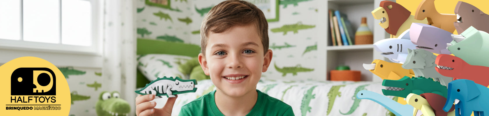A HalfToys é uma linha de brinquedos educativos desenvolvida para unir aprendizado e diversão de maneira interativa. Com o objetivo de despertar a curiosidade natural das crianças, cada brinquedo permite que elas explorem o mundo dos animais de forma prática e envolvente. A proposta é simples e cativante: as crianças começam montando o esqueleto do animal, aprendendo sobre sua estrutura interna, e depois completam a montagem com peças magnéticas que se encaixam perfeitamente.
