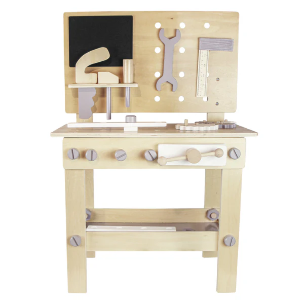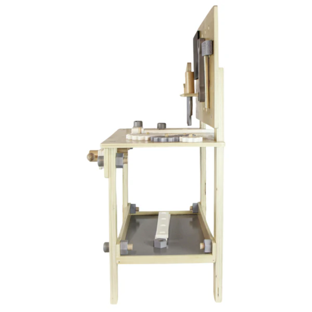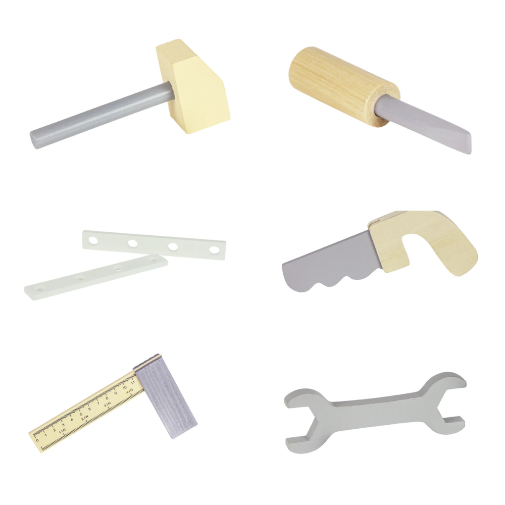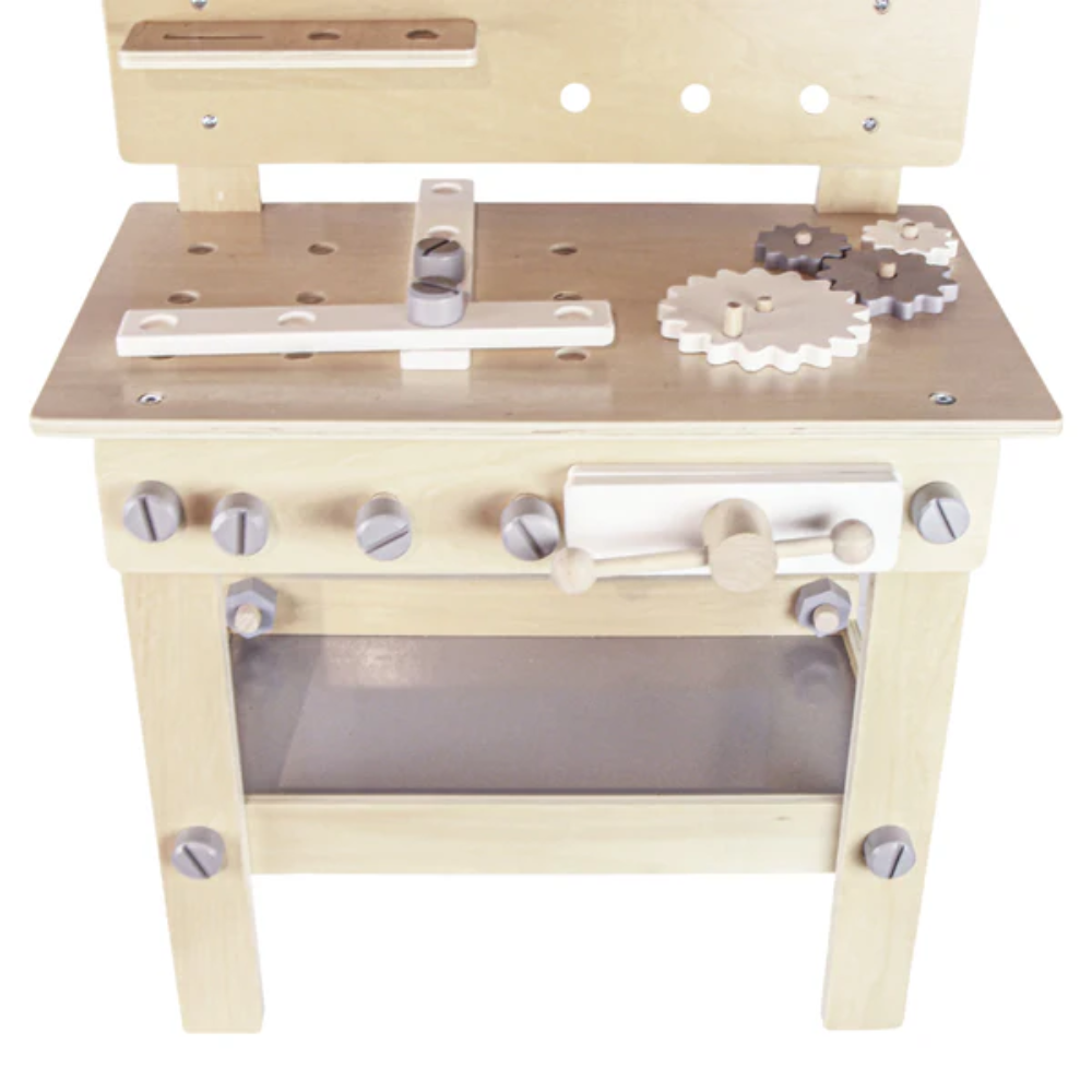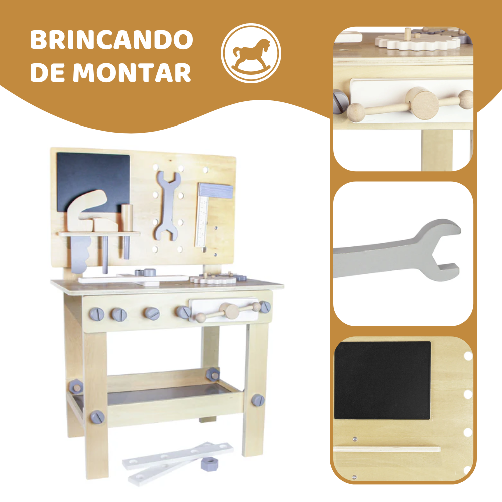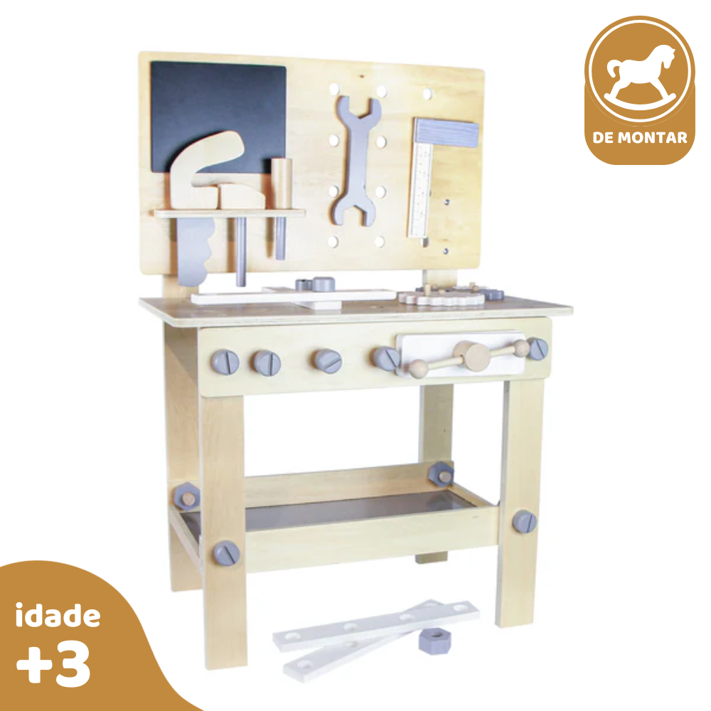 Desperte o marceneiro que existe em seu pequeno com esta incrível Mini Bancada Marceneiro! Confeccionada em MDF com acabamento requintado e pintado à mão, esta bancada da linha de brinquedoteca da Modali Baby transporta as crianças para o universo do faz de conta, onde elas vivenciam o cotidiano de forma lúdica e criativa. Cada peça foi desenhada com detalhes reais para deixar a brincadeira muito mais divertida, estimulando os sentidos por sua textura, pesos e sons. A mesinha é composta por 21 peças, incluindo: 1 serrote (18 x 8,5 x 1,5 cm), 1 chave combinada com imã (16 x 5,5 x 1,5 cm), 1 esquadro com imã (15 x 8,5 x 1,5 cm), 1 martelo (12,5 x 5 x 3 cm), 1 chave de fenda (12 x 2,5 cm), 5 parafusos (6 x 2,5 cm), 4 engrenagens em tamanhos variados (10 x 0,5 cm, 7 x 0,5 cm, 5 x 0,5 cm - 2 brancas e 2 cinzas), 1 porca (1,8 x 3,5 cm), 4 peças de encaixe (1,3 x 22 x 3 cm), 1 torno (4 x 14 x 5 cm) e 1 lousinha (12,5 x 16 x 0,2 cm). Sua estrutura conta com base e painel de apoio, além de um compartimento de 39 x 22 cm para guardar as ferramentas. A altura da bancada até o chão é de 37,5 cm.