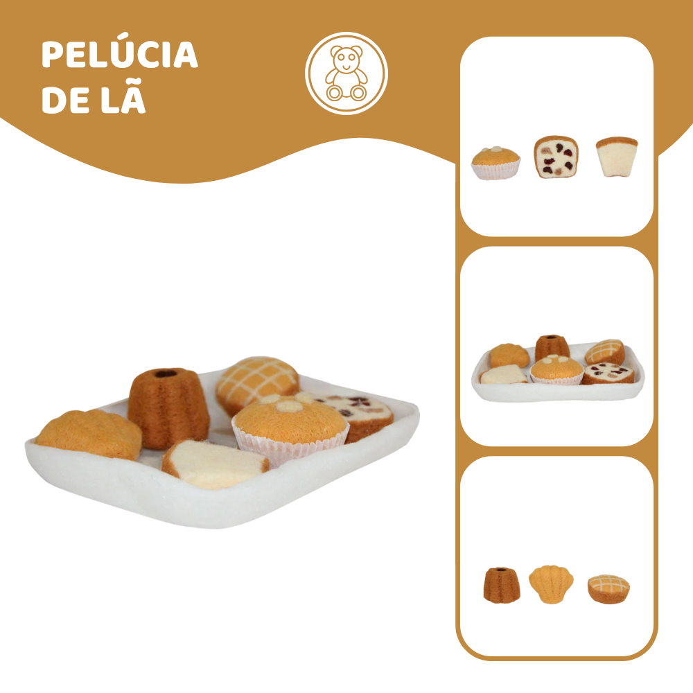 Desperte a imaginação com este delicioso conjunto de bandeja de café da manhã, todo confeccionado em feltro de lã! Inclui pães, bolo, empada, panetone e tortinha, cada peça cuidadosamente elaborada para proporcionar horas de diversão educativa. Perfeito para brincadeiras de faz de conta, este conjunto traz um toque de encanto e criatividade à rotina das crianças, sendo ideal para a brinquedoteca dos pequenos chefs!