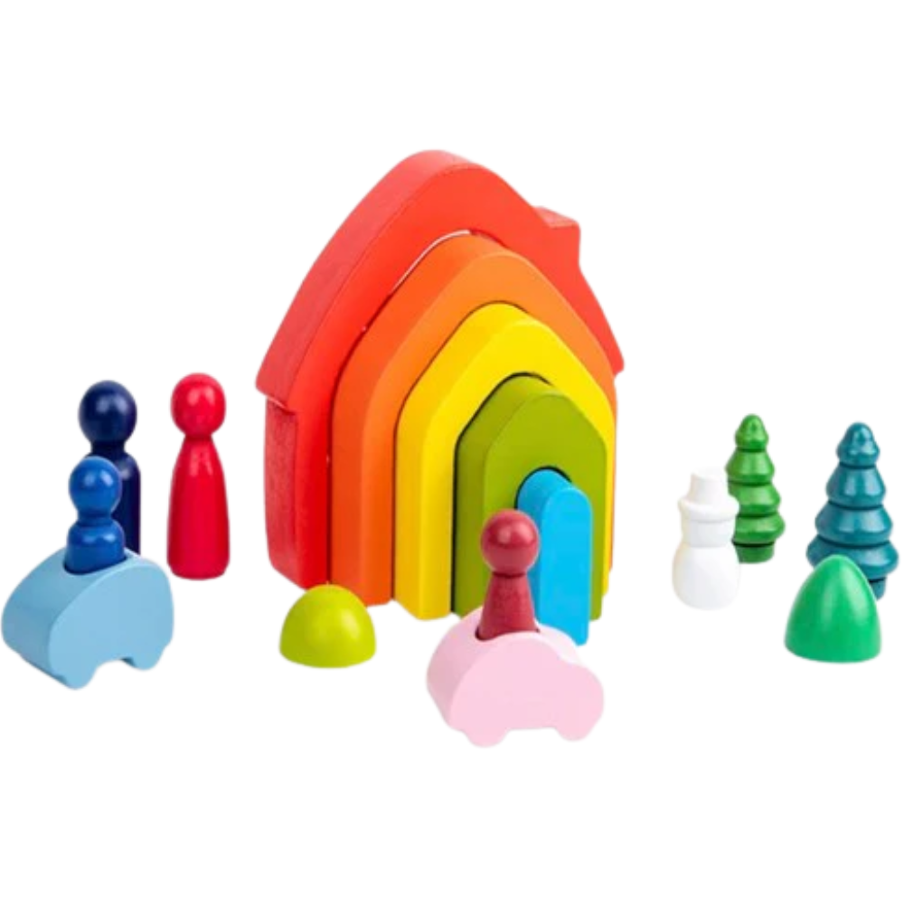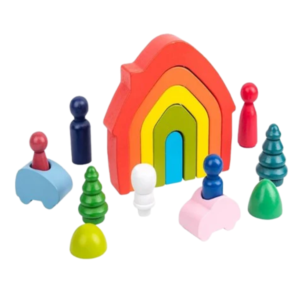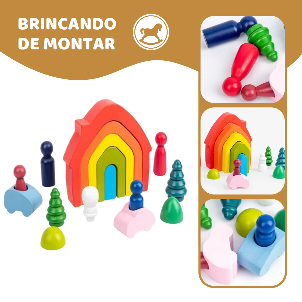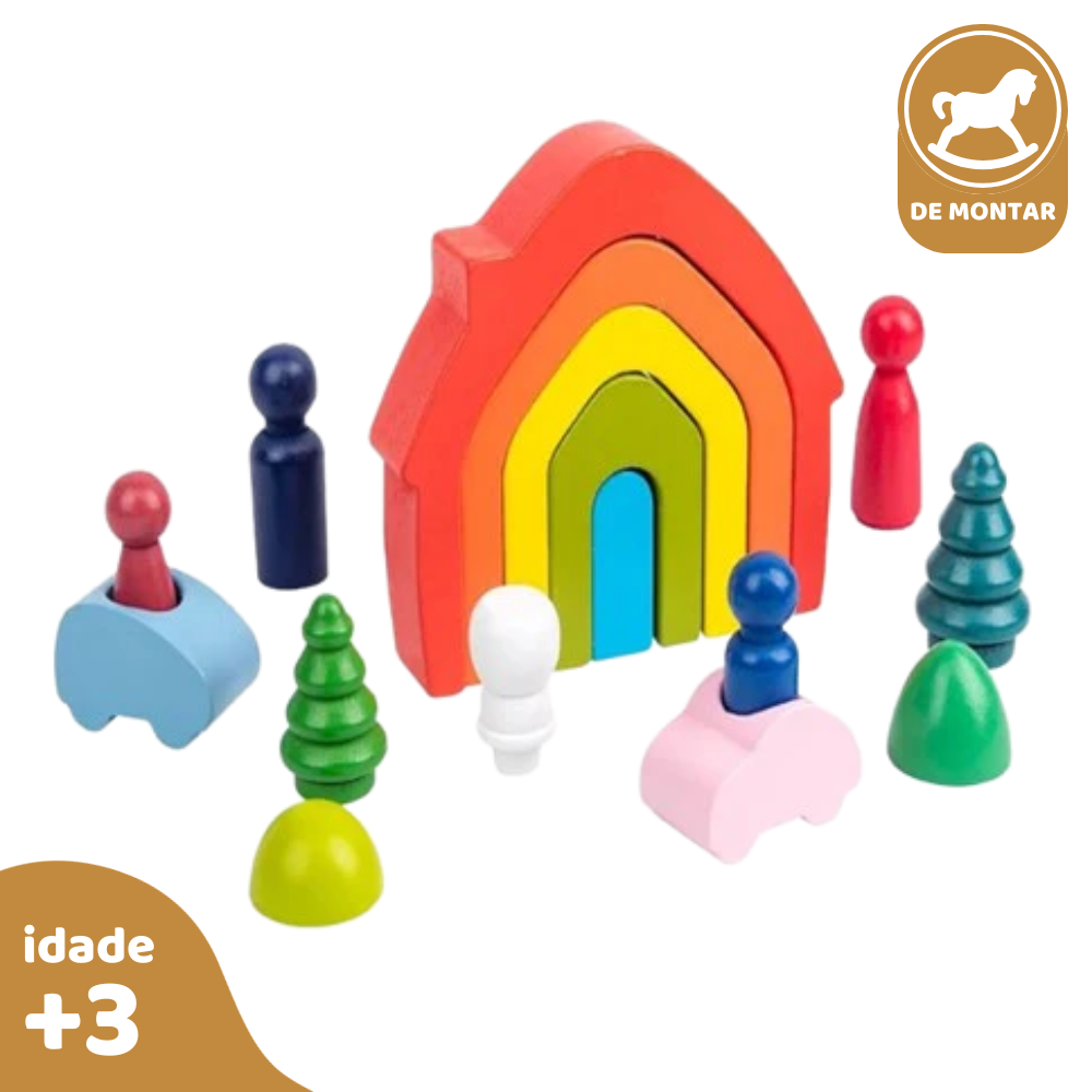 Deixe a imaginação dos pequenos fluir com o nosso encantador Arco-Íris Vilarejo Colorido em madeira! Este brinquedo é ideal para estimular as habilidades de equilíbrio, manipulação de blocos, e o reconhecimento de tamanhos, cores, formas e pesos. O conjunto é composto por 1 casinha, 5 arcos e 11 peças diversas. Reúna as crianças que a brincadeira vai começar! Complete a brinquedoteca com toda a nossa linha para deixar o cardápio de diversão completo. Feito em madeira, é indicado para crianças a partir de 3 anos.