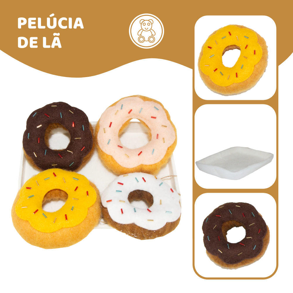 Delicie-se com este irresistível conjunto de donuts em feltro de lã! Este kit inclui 4 peças de donuts com sabores diferentes e granulados coloridos, perfeitos para estimular a criatividade e a imaginação das crianças. Cada donut é cuidadosamente confeccionado, trazendo um toque de diversão e encanto às brincadeiras de faz de conta. Com a bandeja inclusa, é ideal para a brinquedoteca dos pequenos confeiteiros!