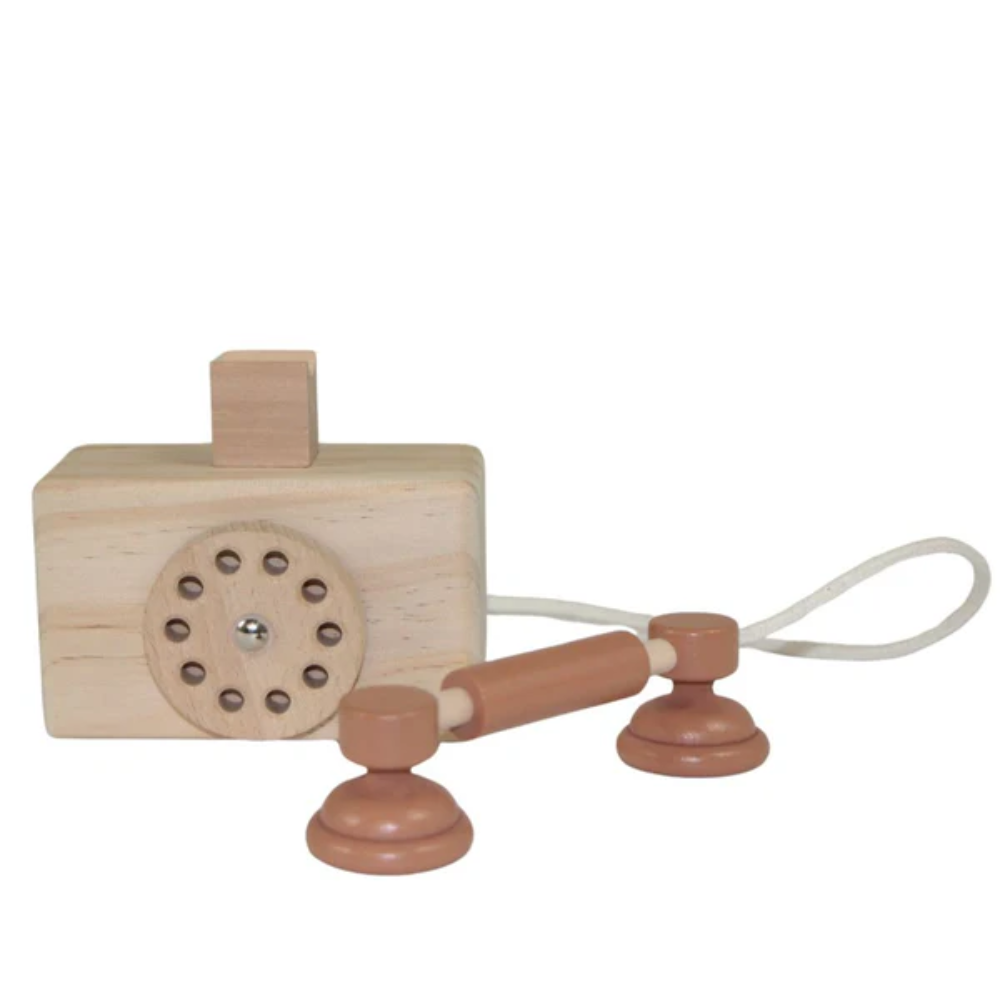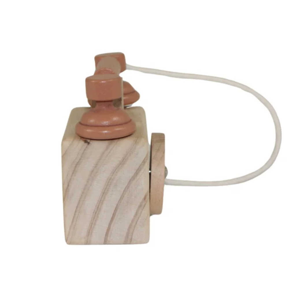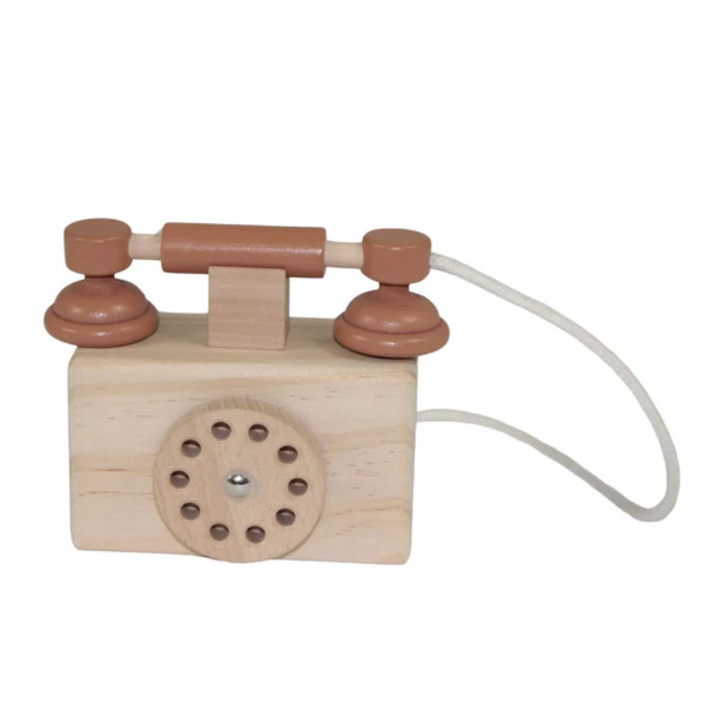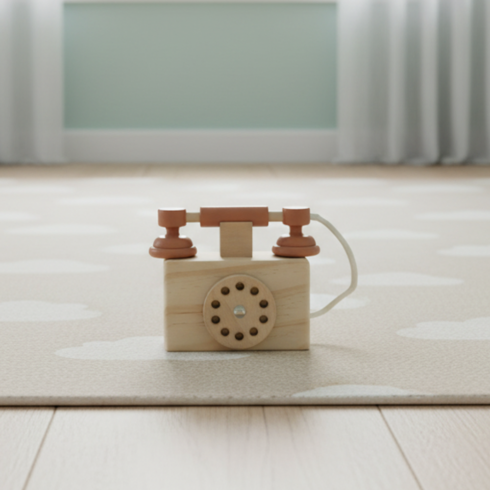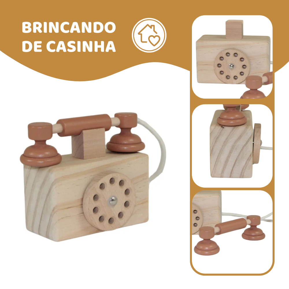 Este charmoso telefone confeccionado em madeira no estilo vintage é um verdadeiro clássico! Ele funciona tanto como um lindo adorno decorativo para qualquer ambiente quanto como um brinquedo que estimula a imaginação e a criatividade das crianças, transportando-as para um mundo de faz de conta e comunicação divertida.